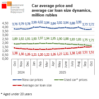 According to the NAPI, in October 2025, the average price for a new car reached 3.72 million rubles, which was a 1% decline on the previous year’s price. The used car cost* fell by 9.3% to 1.71 million rubles. According to the NBCH, the average car loan size in October of the current year was 1.51 million rubles, up 9.4% compared to the similar period last year…