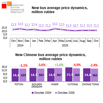 According to the marketing agency NAPI, the average price for new buses* decreased by 1.2 million rubles (-9.8%) over the year, from October 2024 to October 2025. Over the month, from September to October 2025, the average price fell by 148 thousand rubles (-1.3%). Over the year, average prices for new buses by a number of Chinese brands decreased. For example, the price for FOTON fell by 1.1% …
