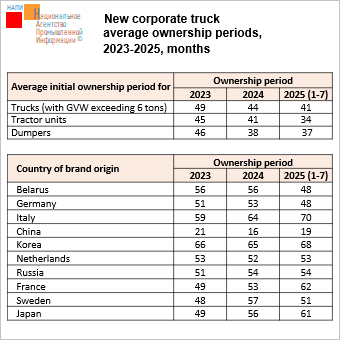 The marketing agency NAPI analyzed the average initial ownership periods for trucks in 2022-2025. Over the first seven months of 2025, the average ownership period for trucks with GVW exceeding 6 tons fell to 41 months, for tractor units — to 34 months, while for dumpers — to 37 months. The main reason is the early withdrawal of vehicles from leasing contracts …