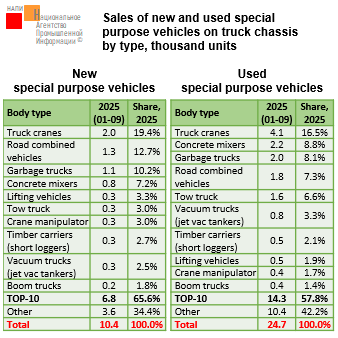 According to the NAPI, in January-September 2025, 10.4 thousand new and 24.7 thousand used special purpose vehicles on the truck chassis were sold*. Truck cranes (19.4%), road combined vehicles (12.7%) and garbage trucks (10.2%) account for the largest shares of sales among new special purpose vehicles …