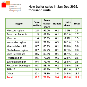 According to the NAPI, 24.7 thousand new trailers and semi-trailers were sold in Jan-Dec 2025, which was a 53.2% decline on the previous year. New trailer sales decreased by 1.4% to 5 thousand units, while semi-trailer sales — by 58.8% to 19.7 thousand units. Sales of used trailers and semi-trailers totaled 72.2 thousand units, which was a 7% decline on 2024…