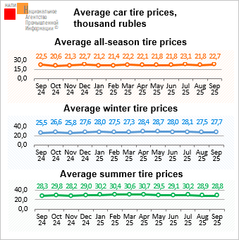 The marketing agency NAPI analyzed the dynamics of average prices for new premium segment tires for cars. Thus, over the year, from September 2024 to September 2025, the average price for all-season tires increased by 1.3%, winter tires — by 8.6%, and summer tires — by 1.6%…