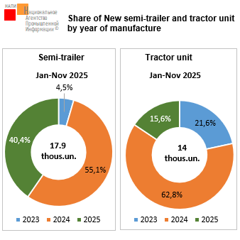 According to the NAPI, over the first 11 months 2025, 72.6 thousand new and used semi-trailers were sold, which was a 30.1% decline on the similar period of 2024. Purchase of new vehicles fell by 59.8%, while that of used ones — by 7.8%. TONAR (3.03 thousand units), BONUM (1.13 thousand units), and CENTERTRANSTEKHMASH (0.95 thousand units) new semi-trailers became sales leaders in Jan-Nov 2025…