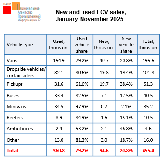 According to the NAPI, 455.4 thousand new and used LCV* were sold in January-November 2025, which was a 9.1% decline on the previous year, when 501 thousand units were sold. Sales of used vehicles fell by 4.3%, while those of new ones — by 23.8%. Among new vehicles, the sharpest sales decline over the year was shown by reefers (-37.8%), dropside vehicles/curtainsiders (-33.9%), and buses (-29.1%) …