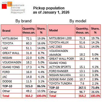 According to the marketing agency NAPI, the pickup population numbered 364.2 thousand vehicles as of January 1, 2026. MITSUBISHI pickups make up a significant part of the population, accounting for 19.8%. Toyota ranks second in the pickup population with a 16.6% share. UAZ rounds out TOP-3 with a 14.0% share…