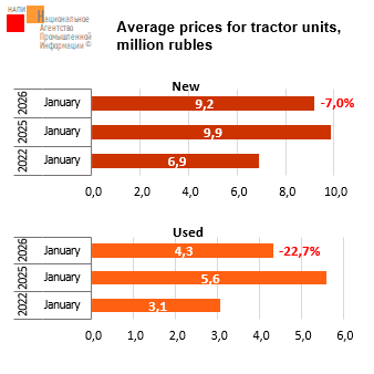 The marketing agency NAPI analyzed the dynamics of average prices for new and used* tractor units. In January 2026, prices for new tractor units decreased, reaching 9.2 million rubles (-7%). The average price for used vehicles sharply declined: the tractor unit cost fell to 4.3 million rubles (-22.7%)…